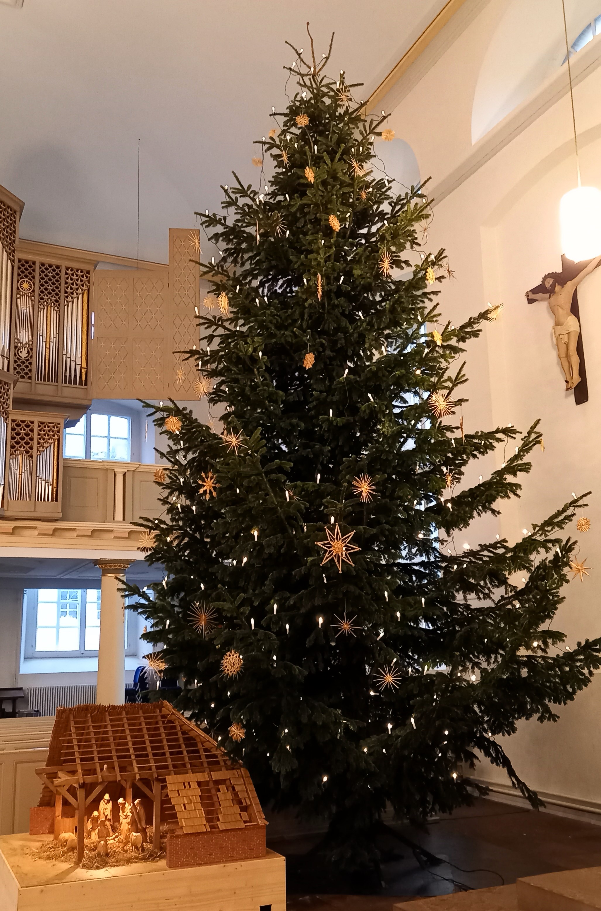 „Puh, geschafft“, war das Friedhofsteam erleichtert, als die sieben Meter hohe Tanne links vom Altar sicher aufgestellt war. Eine Hebebühne erleichterte das Schmücken mit Lichterketten und Strohsternen in Schwindel erregender Höhe. Der Baum wird die Kirche während der sechs Gottesdienste an Heiligabend und Weihnachten und dann bis Epiphanias zum Strahlen bringen: Er bietet einen besonderen, einen erwärmenden Anblick in diesen nasskalten und dunklen Zeiten.