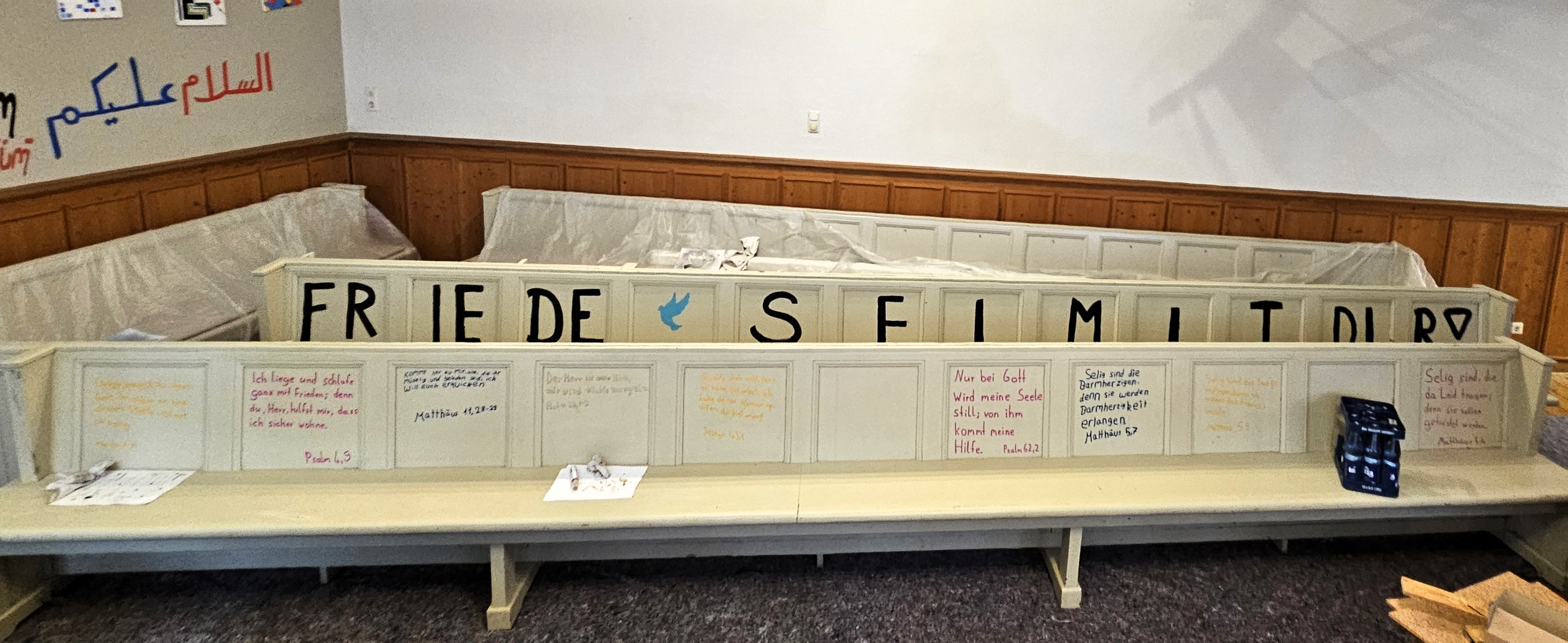Unter Anleitung und mit kreativen Ideen verwandelten die Jugendlichen die beiden alten Bänke aus dem Vorraum des Lamberti-Turmes in besondere Themenbänke: Eine Bank widmet sich dem Thema Frieden, die andere trägt den Titel „Parkplatz für die Seele“. So soll eine kleine Sitzgruppe entstehen, die Besucherinnen und Besuchern der Lambertikirche und des Lambertshofes einen Ort schenken soll, um miteinander ins Gespräch zu kommen oder einfach die Seele baumeln zu lassen.