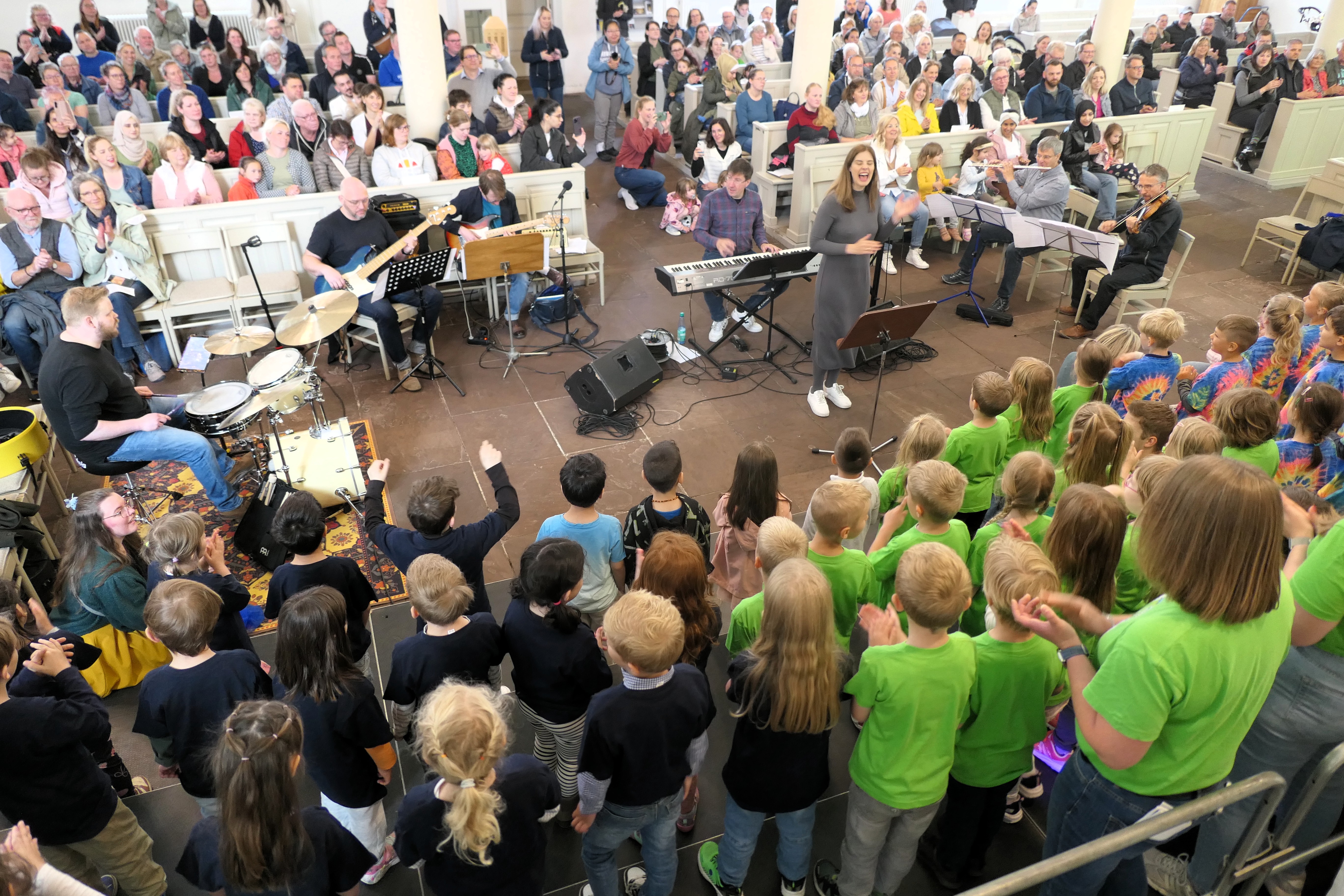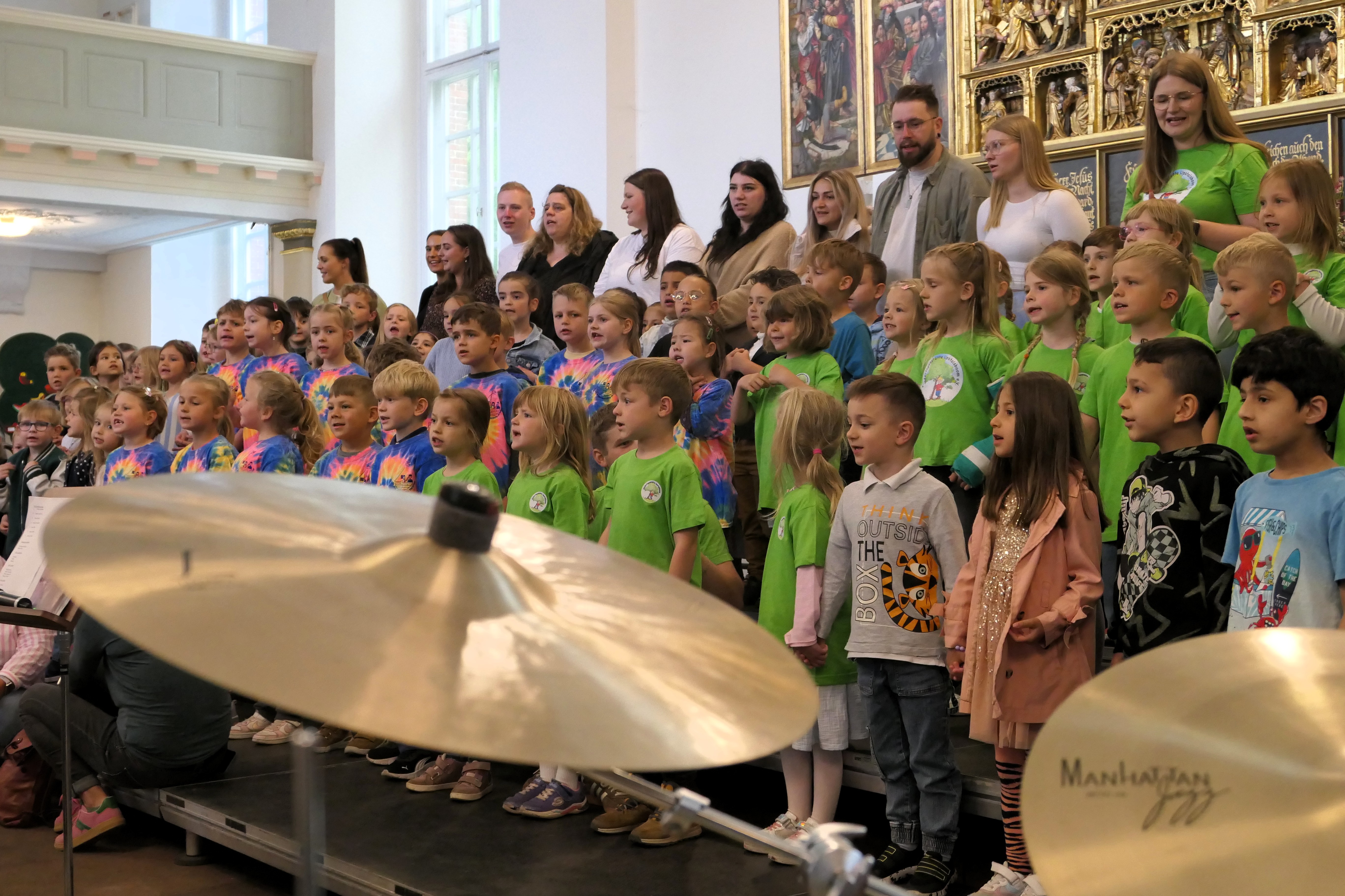 Etwa 150 Vorschulkinder sind am Freitag, 6. Juni, zum gemeinsamen Singen in der Lambertikirche Aurich zusammengekommen. Kirchenmusikerin Helen Kroeker vom Kirchenkreis Aurich hatte zum vierten Mal Kindergärten und Kindertagesstätten eingeladen, sich an dem Projekt „Singen mit Vorschulkindern“ zu beteiligen. Die Kindertagesstätten Lamberti, „Rappelkiste“, Bodelschwingh, Upstalsboom, Victorbur, der Kindergarten „Sandhasen“ und das Montessori-Kinderhaus Aurich waren dabei.