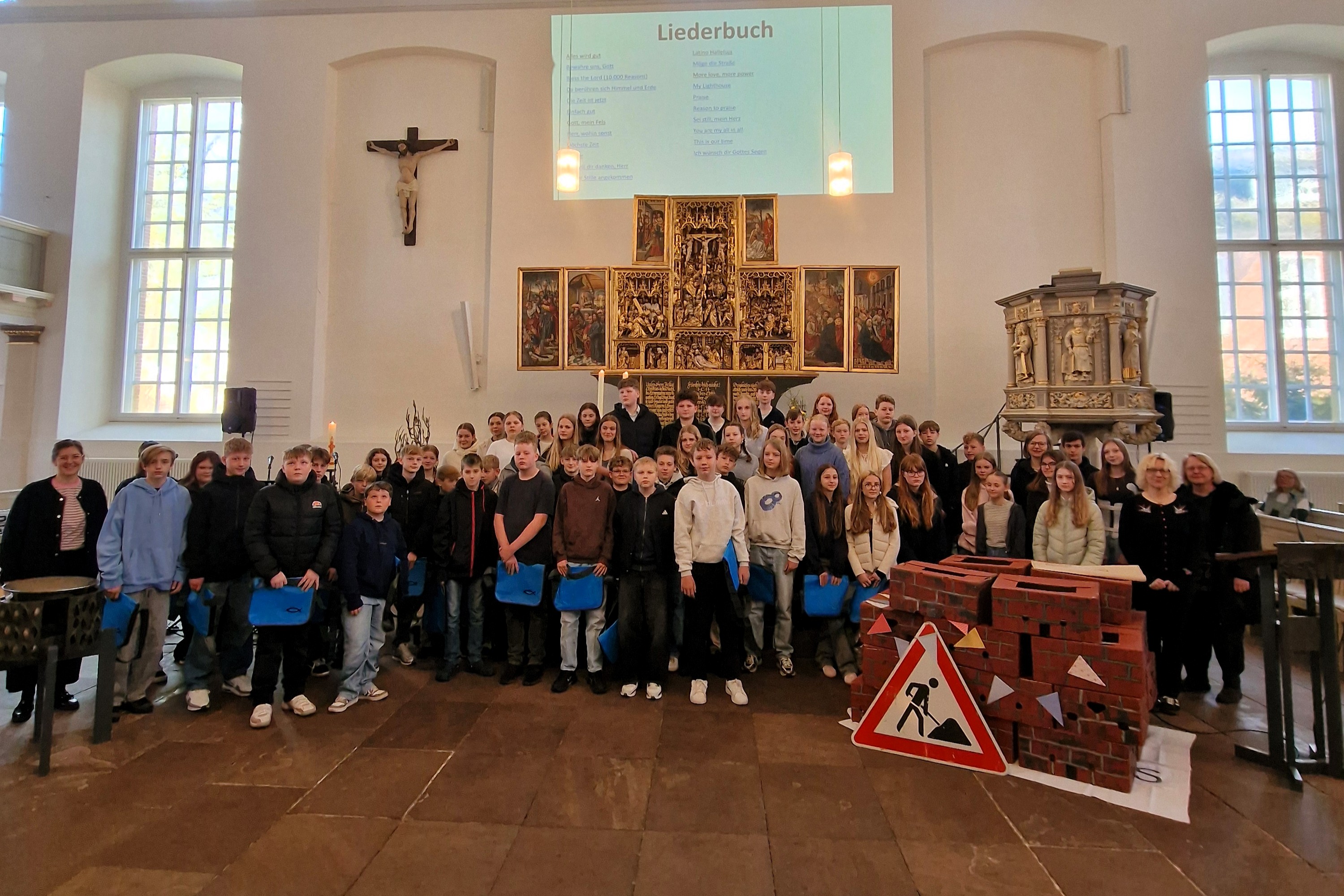 Für die musikalische Gestaltung sorgte die Jugendband. Ein großes Dankeschön an Merle und Sam für den Gesang sowie an Diakon Torsten Hoffmann. Ein Anspiel zum Thema Baustelle brachten Santje, Elise und Madita auf die Bühne und machten schnell klar, worum es während des Konfizeit geht: Nicht um fertige Antworten, sondern ums Ausprobieren, Suchen und Entdecken.